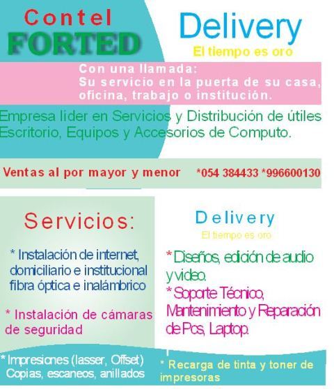 Somos una empresa líder en Servicios y Distribución de útiles, escritorio equipos y accesorios de computo. Destacamos en VENTAS DELIVERY, SERVICIOS DELIVERY .Tenemos un canal de TV por cable, y hacemos transmisiones en vivo.